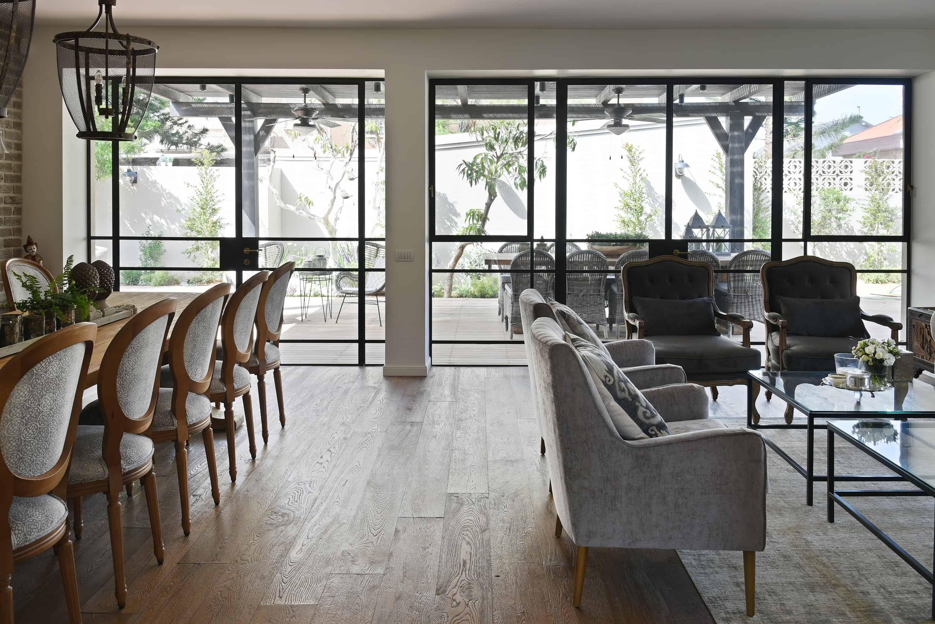 השילובים של ריצוף פרקט עץ אלון כהה בעיבוד כפרי ,קירות מחופים בריקים בגווני מוקה-אפרפר וחלונות מפרופיל בלגי ברזל בצבע שחור מהווים רקע מושלם לפרטי הריהוט והנגרות שהוזמנו בהתאמה אישית, המייצרים זרימה הרמונית בין חללי הבית השונים.