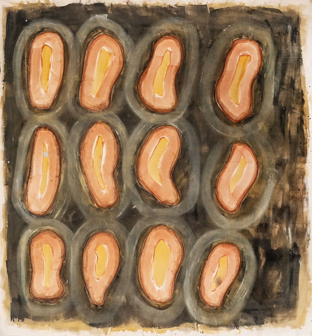 צבעוניות חמה, עבודה באקריליק בסגנון צבעי מים.